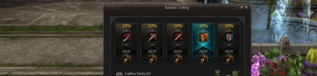 - Random Craft consumes 1,500,000 adena and 1 crafting point, and the character can receive 1 out of 5 items from the list. The probability is the same for all items;